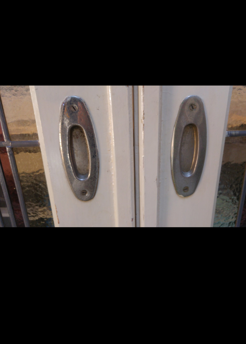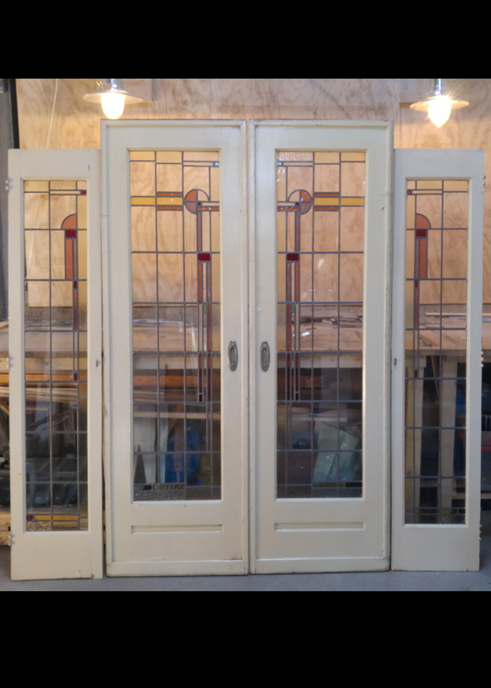 Een hele mooie set ensuite deuren met twee extra glas in lood panelen om deze eventueel in te bouwen in de kasten van de ensuite. De panelen hebben een afmeting van 42,5 cm x 201 cm. De prijs is voor de complete set.